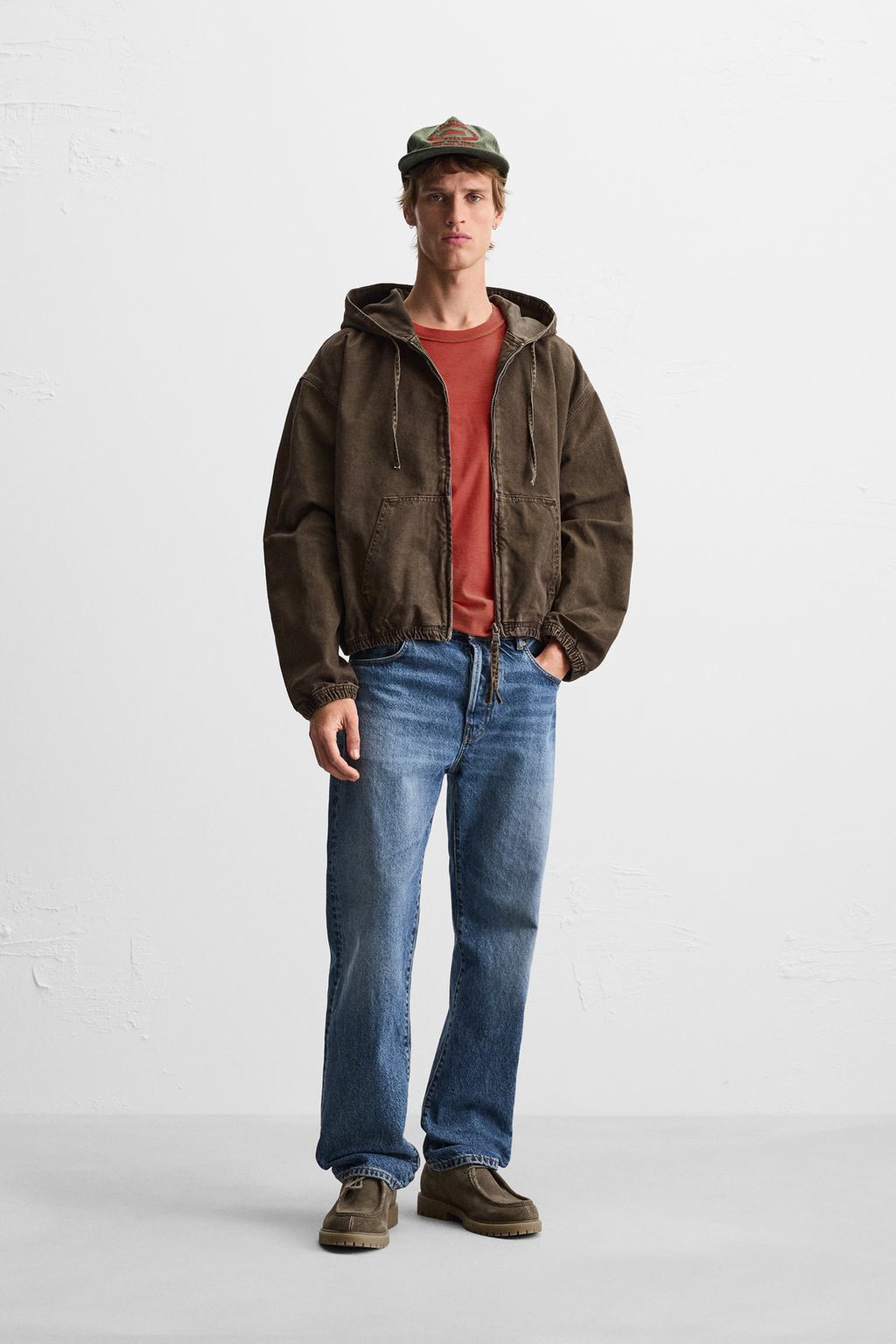 Relaxed fit denim jacket made of cotton denim fabric. Adjustable hooded neckline and long sleeves. Front kangaroo pockets. Elasticated trims. Washed effect. Zip fastening at the front.